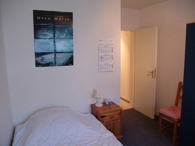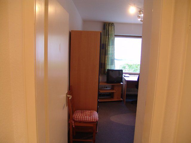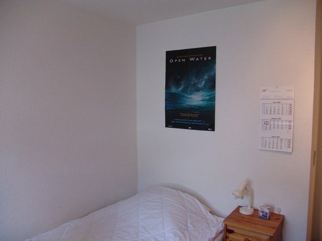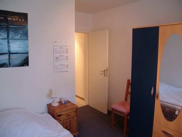 The carpet was replaced by easy-care laminate, walls in woodchip white, ceiling white, radiator white under the window.