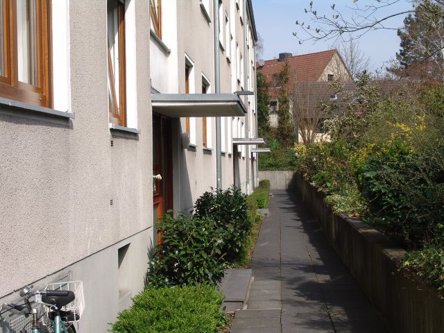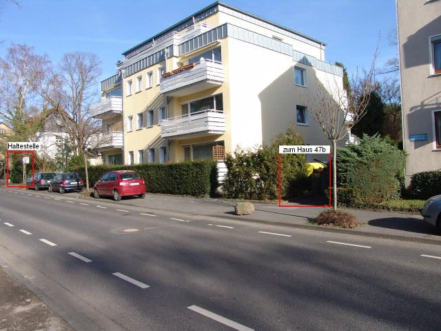 Zum Haus 47b geht es von der Straße links am Haus 49a bzw. 49c vorbei. Ein paar Schritte weiter erreicht man die Hauseingänge. In der Mitte der hinteren Häuserzeile befindet sich der Eingang zum Haus 47b. Dort liegen die drei Wohnungen im Erdgeschoss links und rechts sowie im 1. Obergeschoss rechts mit den hier angebotenen Zimmern 1-9.