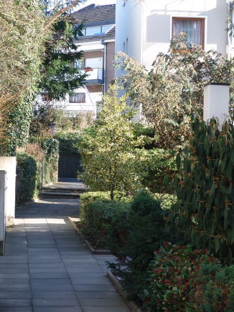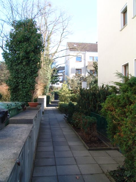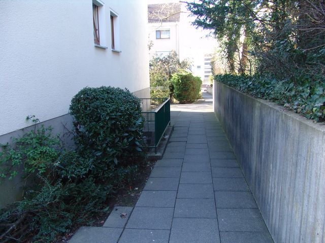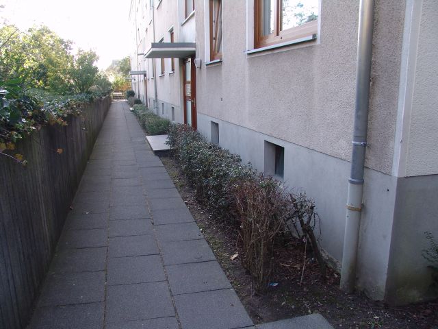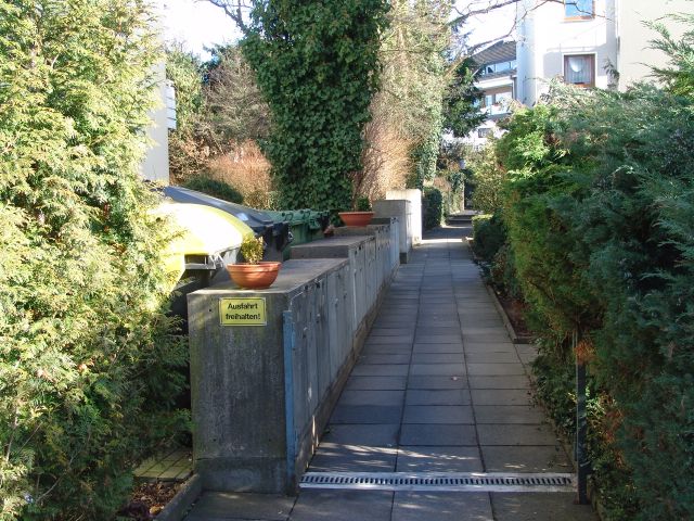 Der Zugang zu den Hauseingängen führt entlang der linken Seite der Häuser, rechts liegt die Zufahrt zur Tiefgarage.
