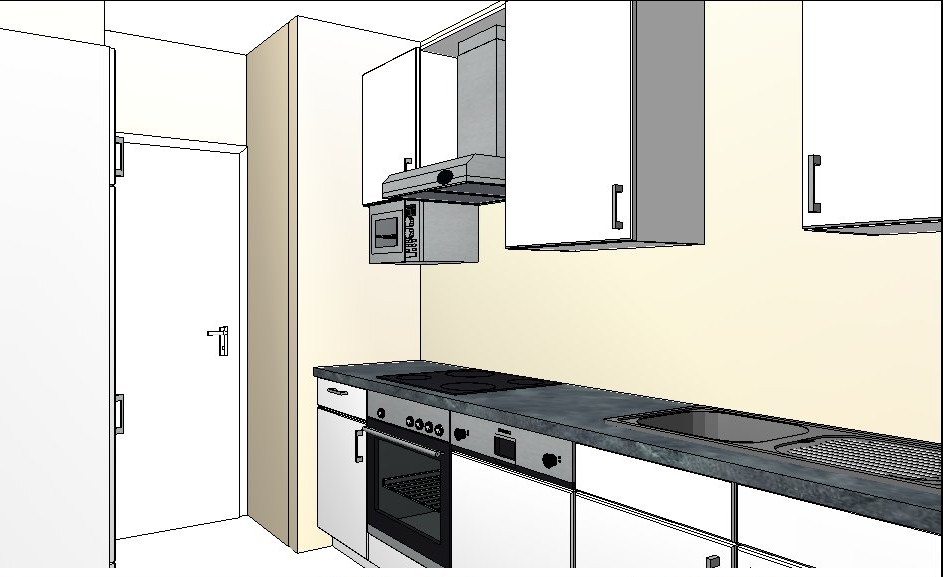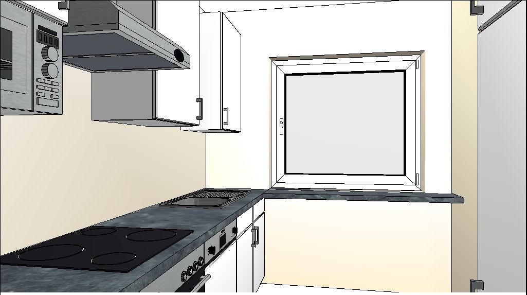 Die Küche wurde vollständig renoviert und mit neuen Möbeln ausgestattet. Ein Untertischspeicher stellt heißes Wasser her. Es sind ein Herd mit Cerankochfeld und Backofen sowie eine Geschirrspülmaschine eingebaut. In der Mikrowelle können blitzschnell Speisen zubereitet werden. Toaster und Heißwassertopf gehören zur Einrichtung. Die mehrstufig einstellbare Dunstabzugshaube ist an einen Abluftkanal angeschlossen. Außerdem wurde der alte Gußheizkörper gegen einen modernen Flachheizkörper ausgetauscht. Der Rollladen läßt sich bequem mit elektrischem Antrieb bedienen. Steckdosen sind in ausreichendem Umfang vorhanden. Die Deckenlampe hat 4 Halogenbirnen.